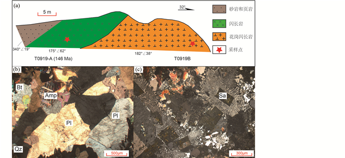 图 2 哲古错花岗闪长岩的野外素描图(a)和显微镜下照片(b、c) Qz-石英;Pl-斜长石;Amp-角闪石;Bt-黑云母;Sa-透长石 Fig. 2 Field sketch map (a) and photomicrographs (b, c) of granodiorite (Sample T0919-B) from Zhegu Co area |