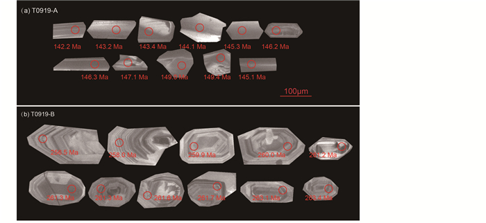 为确定样品闪长岩T0919-A和花岗闪长岩T0919-B的年龄,进行了锆石年代学分析。首先,样品锆石通过重液和磁选进行分离,之后在双目镜下挑选晶型较好、无明显裂纹和基本无包裹体的锆石。选定的锆石颗粒被嵌入到25mm的环氧树脂圆盘中,之后将环氧树脂靶进行粗磨和细磨,直到锆石内核部出露,之后进行抛光、清洗并做成样品靶。阴极发光图像是在中国地质科学院北京离子探针中心获得的。阴极发光图像(图 3)和背散射电子成像显示了锆石晶粒的内部生长结构。