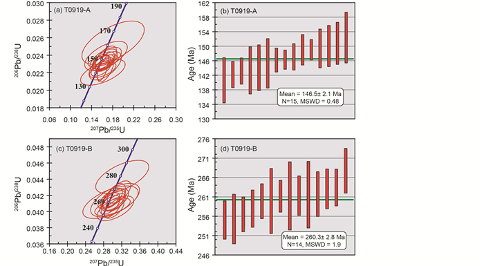 图 4 哲古错地区闪长岩(T0919-A)(a、b)和花岗闪长岩(T0919-B)(c、d)的锆石U-Pb定年谐和图和加权平均年龄图 Fig. 4 U-Pb concordia diagrams and weighted average age diagrams for diorite (T0919-A) (a, b) and granodiorite (T0919-B) (c, d) from Zhegu Co area |