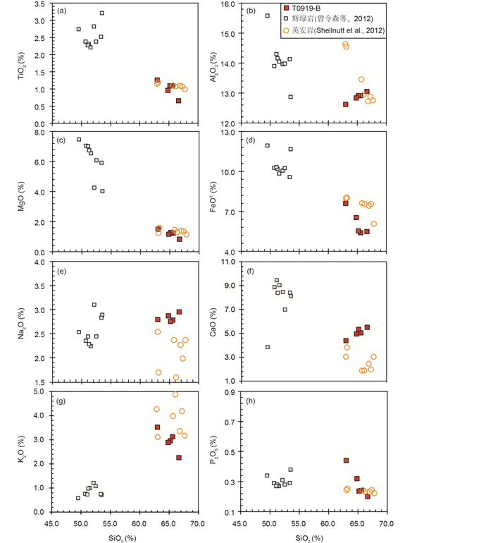 图 5 哲古错花岗闪长岩及同时代辉绿岩和英安岩的主量元素TiO2 (a)、Al2O3 (b)、MgO (c)、FeOT (d)、Na2O (e)、CaO (f)、K2O (g)、P2O5 (h)与SiO2之间的协变图 Fig. 5 Co-variation diagram of major elements TiO2 (a), Al2O3 (b), MgO (c), FeOT (d), Na2O (e), CaO (f), K2O (g) and P2O5 (h) against SiO2 in granodiorite from Zhegu Co and contemporaneous diabase and dacite |