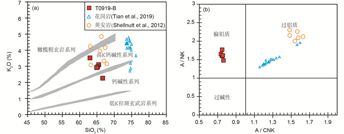 图 6 哲古错花岗闪长岩的K2O-SiO2 (a, 据Le Maitre et al., 1989; Rickwood, 1989)和A/NK-A/CNK (b, 据Maniar and Piccoli, 1989)关系图解 Fig. 6 Plots of K2O vs. SiO2 (a, after Le Maitre et al., 1989; Rickwood, 1989) and A/NK vs. A/CNK (b, after Maniar and Piccoli, 1989) for granodiorite from Zhegu Co |