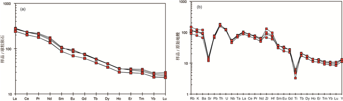 图 7 哲古错花岗闪长岩的球粒陨石标准化稀土元素配分图解(a)和原始地幔标准化蜘蛛网图(b)(标准化值据Sun and McDonough, 1989) Fig. 7 Chondrite-normalized rare earth elements distribution pattern (a) and primitive mantle (PM)-normalized trace elements spider diagrams (b) for granodiorite from Zhegu Co (normalization values after Sun and McDonough, 1989) |