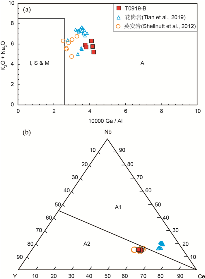 花岗闪长岩具有高SiO2、Na2O+K2O、Nb、Y和Ce,低CaO和Sr,Zr和Hf正异常等特征,这和A型花岗岩的特征类似(Whalen et al., 1987)。在主量元素对图解中(图 5),花岗闪长岩的Al2O3、Na2O、CaO和SiO2有明显的正相关关系,而TiO2、MgO、FeOT、K2O、P2O5和SiO2有明显的负相关关系,与同时代基性岩对比(曾令森等, 2012),除Al2O3和P2O5之外,其余主量元素都显现出一定的相关关系,表明二者可能具有成因上的联系。与此同时,在与Panjal Traps的英安岩(Shellnutt et al., 2012)对比中,发现二者SiO2含量几乎一致,且在TiO2、MgO、FeOT和P2O5上极为相似,但在Al2O3、Na2O、CaO和K2O上有较大区别,表明二者可能经过不同的分离结晶过程。在SiO2-K2O关系图解中(图 6a),绝大多数花岗闪长岩样品都落在高K钙碱性区域,这和显微文象结构(图 2c)相一致,表明其具有碱性花岗岩属性,与A型花岗岩相似。与错那~137Ma的花岗岩(Tian et al., 2019)及同时代英安岩(Shellnutt et al., 2012)对比,可见三者都基本属于高K钙碱性系列(图 6a)。在A/CNK-A/NK关系图解中(图 6b),花岗闪长岩样品和英安岩落在了偏铝质区域,而错那花岗岩则落在了过铝质区域,表明三者源区物质存在一定区别。在(K2O+Na2O)-10000Ga/Al判别图解(图 9a)中,该花岗闪长岩样品、英安岩和错那花岗岩都落在了A型花岗岩区域,揭示了其三者A型花岗岩的属性。但在Ce-Nb-Y三角判别图解中(图 9b),所有的花岗闪长岩样品和英安岩都落在了A2型花岗岩区域,表明这些花岗闪长岩和英安岩具有A2型花岗岩属性;而所有的错那花岗岩都落在了A1型花岗岩区域。
