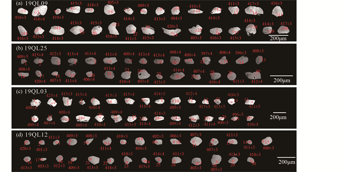 石榴黑云斜长片麻岩 样品19QL09中的独居石为浅黄色, 颗粒大小不一, 其长轴约50~120μm, 个别颗粒可达150μm以上, 形态多为椭圆状晶体形态, 部分为柱状晶形。背散射图像可见绝大部分独居石环带微弱(图 7a)。本样品共30个测点, 206Pb/238U加权平均年龄为413.7±1.6Ma (MSWD=2.1)(图 8a),代表变质时代。