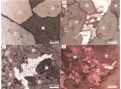 图 4 良源铌钽铷钨矿床石英脉型黑钨矿+云英岩型铌钽铷+花岗岩型铌钽铷矿体特征照片 (a、b)石英脉型矿体;(c)云英岩型矿体;(d)花岗岩型矿体.Py-黄铁矿;Mol-辉钼矿;Wf-黑钨矿;Ccp-黄铜矿;Bn-斑铜矿;Ms-白云母;Qz-石英;Pl-斜长石 Fig. 4 Characteristics of quartz vine-type tungsten orebody+greisen type Nb-Ta-Rb orebody+granite type Nb-Ta-Rb orebody in the Liangyuan Nb-Ta-Rb-W deposit (a, b) quartz vein-type ore body; (c) greisen-type orebody; (d) granite-type orebody. Py-pyrite; Mol-molybdenite; Wf-wolframite; Ccp-chalcopyrite; Bn-bornite; Ms-muscovite; Qz-quartz; Pl-plagioclase |