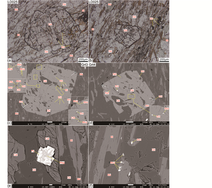 图 2 石榴石显微照片及背散射图像分析(包体和剖面方向) (a、b)石榴云母片岩(LD025)显微图像;(c) Grt3背散射图像、包体及剖面方向;(d) Grt4背散射图像、包体及剖面方向;(e、f)石榴云母片岩基质磷钇矿、独居石、黄铁矿、方解石等副矿物 Fig. 2 Micro pictures and BSE images (inclusions and profiles direction) (a, b) micro pictures of garnet-mica schist (LD025); (c) the BSE image, inclusion types and content profile of Grt3; (d) the BSE image, inclusion types and content profile of Grt4; (e, f) the matrix accessory minerals such as Xtm, Mnz, Py, Cal of garnet-mica schist |