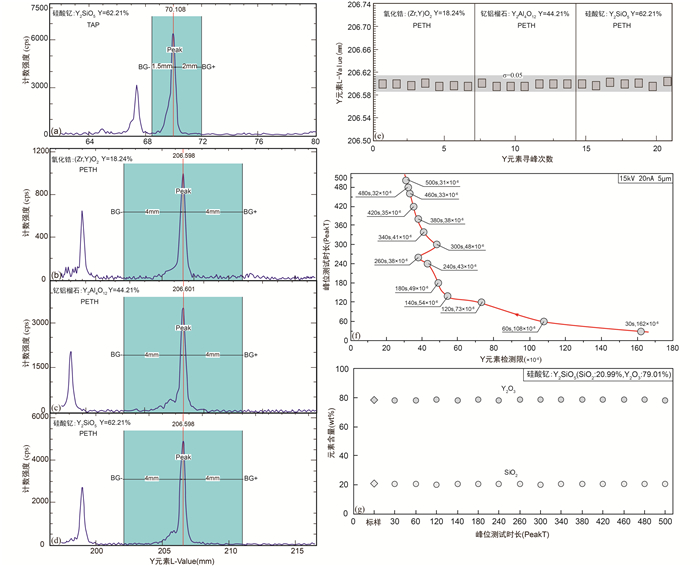 图 3 钇(Y)元素L-Value特征、峰位稳定度、检测限曲线与标样稳定度测试图解 (a)使用分光晶体TAP测试Y元素的峰位特征;(b-d)使用分光晶体PETH测试Y元素的峰位特征;(e)标样Y元素含量差异大时,PETH测试Y元素的峰位稳定度;(f) PETH测试Y元素的检测限特征曲线;(g)标样硅酸钇的稳定度测试(矿物结构式书写据标样GB/T 17359—1998) Fig. 3 The diagram of L-Value, peak position stability, detection limit curve and standard stability of yttrium (Y) by EPMA analysis (a) the feature of Y peak position analyzed by crystal TAP; (b-d) the feature of Y peak position analyzed by crystal PETH; (e) the peak positon stability analysis by crystal PETH when Y with huge content difference; (f) the detection limit curve of Y by crystal PETH; (g) the stability analysis on standard Y2SiO5 by crystal PETH (Mineral formula according to standard GB/T 17359—1998) |