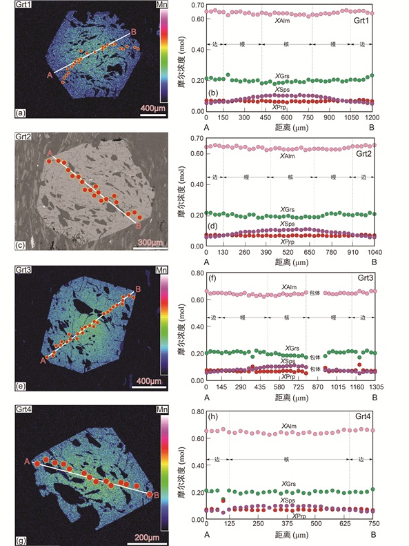 Grt1:Mg、Fe和Ca元素变化相对较小,仅在边部窄带呈缓慢升高和降低趋势,XAlm核部-幔部呈平缓曲线,自幔部至边部存在对称下降趋势,XGrs核部成分平缓,至边部略有升高,XPrp整体呈平缓曲线,边部略有升高(0.07~0.08),XSps则呈典型的钟形环带特征(图 4a, b)。核部、幔部和边部端元组分XSps、XGrs、XAlm和XPrp变化范围分别为0.10~0.11、0.18~0.21、0.62~0.64、0.06~0.07,0.07~0.10、0.20~0.24、0.63~0.66、0.06~0.07和0.05~0.07、0.22~0.23、0.64~0.66、0.07~0.08。