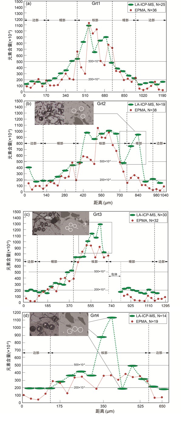 本次4颗石榴石主微量分析结果显示Y元素含量曲线与Mn元素含量曲线具有类似的钟形分布特征,但Y元素含量曲线揭示出Mn元素曲线没有显示的形成环境的某些重要变化,可能为晚期变质改造、副矿物分解或微量元素扩散速度的改变等。EPMA和LA-ICP-MS石榴石Y元素分析结果显示4颗石榴石中核部和幔部的含量较为吻合(Y>200×10-6),二者的边部成分和曲线特征(Y < 200×10-6)存在较大差异。该特征表明EPMA对于Y元素含量小于200×10-6时的分析精度有待进一步提高,但含量变化趋势仍然保持较好的统一性(图 4a, b)。