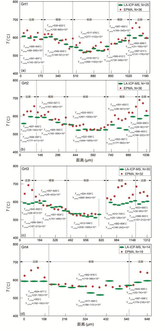Grt4的温度计算结果揭示其具明显的核-边结构,如图 6d所示,EPMA分析结果显示核部温度为T=562~616℃(Y=119×10-6~386×10-6),平均温度为T=573±15℃(n=12),边部温度范围为T=624~685℃(Y=32×10-6~102×10-6,n=7),核部至边部温度变化显著。LA-ICP-MS的分析结果显示核部温度范围为T=517~595℃(Y=186×10-6~1131×10-6),平均温度为T=558±24℃(n=9),边部温度范围为T=587~596℃(Y=179×10-6~218×10-6,n=5),温度整体较为统一。其中,EPMA数据显示Grt4自核部至边部温度变化较大,且温度曲线与Grt1~Grt3基本相同,核部温度高于后者,与其幔部温度在误差范围内一致(图 6d;表 5)。