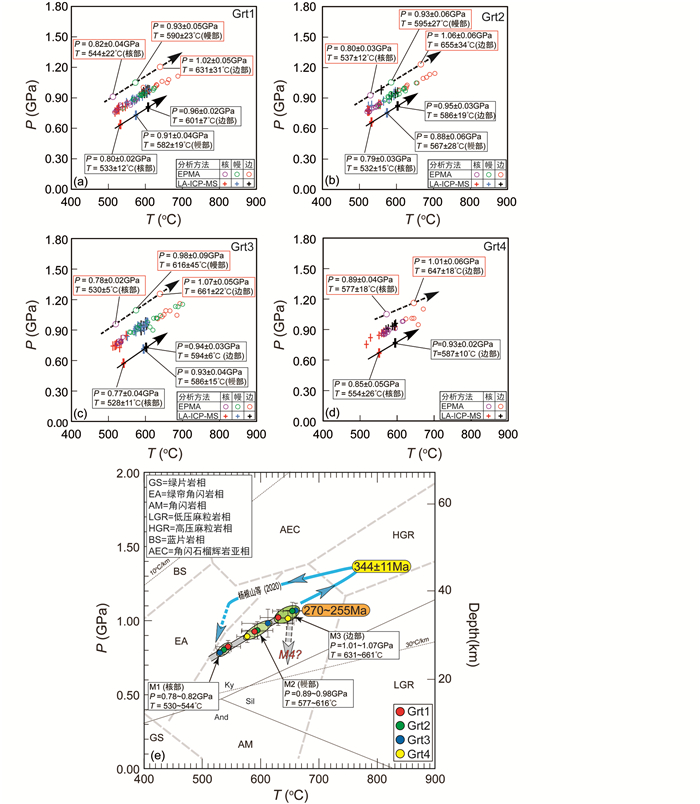 当应用LA-ICP-MS的分析数据时,自核部→幔部→边部,大颗粒的石榴石平均温压变化为:①Grt1:T=533±12℃和P=0.80±0.02GPa→T=582±19℃和P=0.91±0.04GPa→T=601±7℃和P=0.96±0.02GPa(图 7a);②Grt2:T=532±15℃和P=0.79±0.03GPa→T=567±28℃和P=0.88±0.06GPa→T=586±19℃和P=0.95±0.03GPa(图 7b);③Grt3:T=528±11℃和P=0.77±0.04GPa→T=586±15℃和P=0.93±0.04GPa→T=594±6℃和P=0.94±0.03GPa(图 7c)。小颗粒的石榴石(Grt4)核、边的平均温压变化为:T=554±26℃和P=0.85±0.05GPa→T=587±10℃和P=0.93±0.02GPa(图 7d)。
