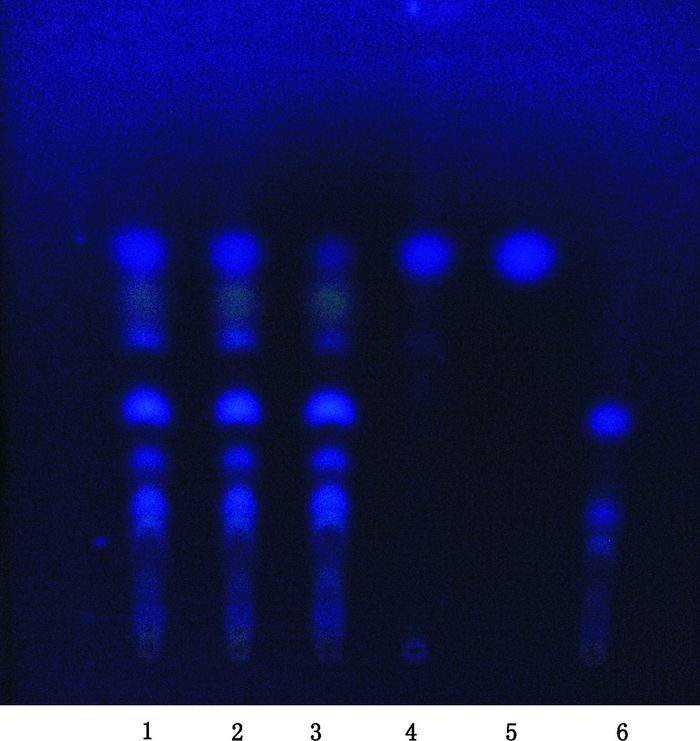 1~3.样品(samples)4.蛇床子对照药材(reference crude drug of Cnidii Fructus)5.蛇床子素对照品(reference substance of osthol)6.缺蛇床子阴性样品(negative sample without Cnidii Fructus) 图 5 鉴别蛇床子的TLC图 Figure 5 TLC chromatogram of Cnidii Fructus |