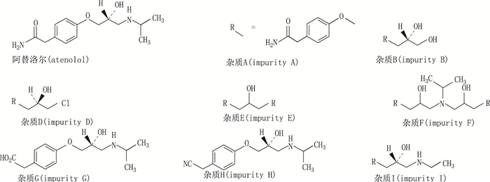 阿替洛尔为选择性β1肾上腺素受体阻滞剂,主要用于治疗高血压、心绞痛、急性心肌梗死,也可用于心肌病和心律失常等[1-7]。目前全国共有阿替洛尔片剂生产企业70个,涉及批准文号105个。经国内文献和外标准查询,英国药典2015年版、欧洲药典8.0版收载了阿替洛尔的8个杂质[8-9](图 1),但国内少有针对阿替洛尔片有关物质的系统研究与结构鉴定报道。