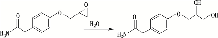 根据质谱解析结果及英国药典2015年版收载的阿替洛尔8个已知杂质结构(图 1),结合阿替洛尔合成路线,最终确定上述4个杂质的结构和化学名,见表 3,其中:杂质1为未知杂质,可能为缩合物被氨水开环得到,氨水可能来源于异丙胺,其可能的生成途径见图 9;杂质2即英国药典2015年版收载的杂质A,为未反应完全而残留的对羟基苯乙酰胺;杂质3即英国药典2015年版收载的杂质B,可能为缩合物被水开环得到,水可能来源于氢氧化钠碱液,其可能的生成途径见图 10;杂质4为未知杂质,来源有待进一步考察。