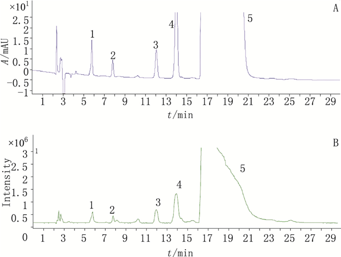 1 仪器与试药 1.1 仪器安捷伦公司Agilent 1260高效液相色谱仪及工作站;安捷伦公司Agilent 6530精确质量数四极杆-飞行时间质谱仪及工作站;沃特世公司Waters X-Bridge C18色谱柱(4.6 mm×250 mm,5 μm;填料:十八烷基硅烷键合硅胶)。