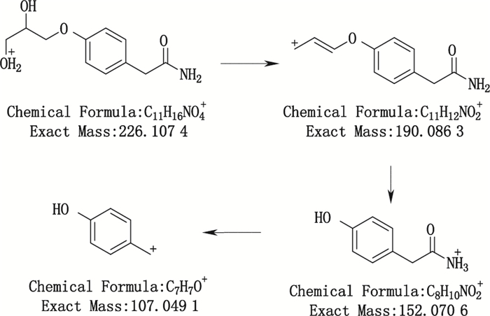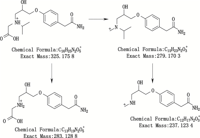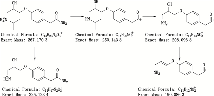 LC-MS/MS测得主化合物阿替洛尔的[M+H]+离子为m/z 267.170 3,其中子离子m/z 250.143 8为主化合物的[M+H]+离子丢失一分子氨基后形成的碎片离子;子离子m/z 225.123 4为主化合物的[M+H]+离子中性丢失异丙基后形成的碎片离子;子离子m/z 208.096 8为m/z 250.123 4脱去异丙基后形成的碎片离子;子离子m/z 190.086 3为m/z 208.096 8脱去一分子H2O后形成的碎片离子。其[M+H]+的MS2可能的裂解途径如图 3所示。