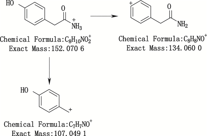 杂质2的[M+H]+离子为m/z 152.070 6,与[C8H10NO2]+离子式相对应。子离子m/z 134.060 0为杂质2的[M+H]+离子脱去一分子H2O后形成的碎片离子,说明该杂质含有裸露的羟基;子离子m/z 107.0491为杂质2的[M+H]+离子脱去乙酰基后形成的碎片离子。综上所述,杂质2所推测的结构及其[M+H]+离子MS2裂解途径见图 5。