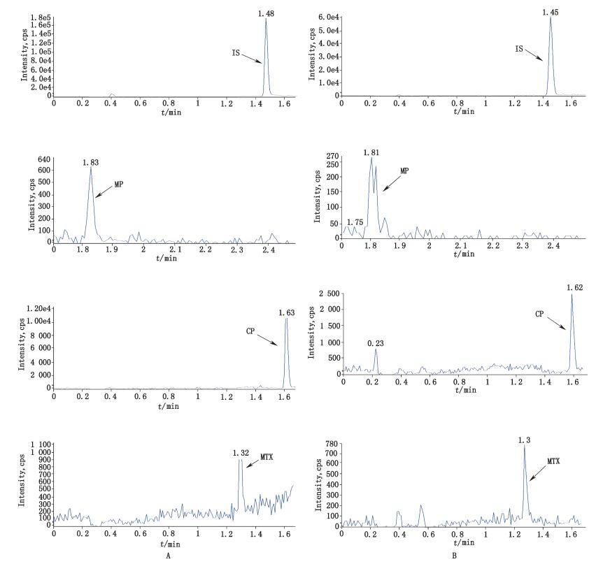 2.4.2 质谱三重四极杆串联质谱仪,电喷雾离子源(ESI),Sciex公司Analyst v1.5.1工作站。离子源温度500 ℃,CAD为7,喷口电压为5 500 V,雾化气Gas1为50,Gas2为50。采用正离子和负离子扫描,多反应监测(MRM)的质谱扫描方式进行测定。MP为负离子扫描,MRM离子对为m/z 373.1→343.2;CP为正离子扫描,MRM离子对为m/z 261.0→233;MTX为正离子扫描,MRM离子对为m/z 455.0→308;内标4-氨基苯乙酮为正离子扫描,MRM离子对为m/z 136.0→93.8。