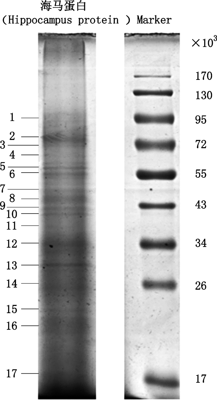 将图 2中SDS-PAGE标注的条带切下,共切得17个条带,分别放入离心管中,将条带切成约1 mm3大小的小块,用100 mmol·L-1碳酸氢铵溶液[含30%(v/v)乙腈]溶液洗涤至无色,去除上清液,冻干,每管加入100 mmol·L-1碳酸氢铵溶液90 μL和100 mmol·L-1二硫苏糖醇溶液10 μL,在56 ℃孵育30 min,去上清,加入50 μL乙腈洗涤2次,冻干,每管加入100 mmol·L-1碳酸氢铵溶液70 μL和200 mmol·L-1碘乙酰胺溶液30 μL,室温避光孵育20 min,去上清,加入50 μL乙腈洗涤2次,冻干,加入测序级胰蛋白酶(10 ng·μL-1)5 μL,放入4 ℃冰箱30 min,再加入50 mmol·L-1碳酸氢铵溶液30 μL,放入37 ℃恒温培养箱中过夜消化得酶解液,吸取酶解液到新的离心管中,原管加入含0.1%(v/v)甲酸和60%(v/v)乙腈的水溶液100 μL,超声15 min,吸出溶液并入前次溶液,此步骤重复3次,合并,冻干,得海马蛋白质胶内酶解物。