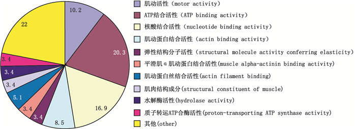 3.3 提取海马蛋白质组功能分析对鉴定到的192种蛋白质在DAVID Bioinformatics Resources 6.8数据库中搜索分析,考察了海马蛋白质的分子功能,具体分布见图 3。由图 3可见,在所鉴定的蛋白质中,具有结合活性的蛋白质占较大比例(54.2%),进一步分析结合活性蛋白,ATP结合活性蛋白含量最高(20.3%),嘌呤核苷酸结合活性次之(16.9%),此外还包括肌动结合蛋白活性、微丝结合蛋白活性、平滑肌a肌动蛋白结合蛋白活性(如表 2所示),这些功能都参与人体重要的代谢过程[13]。除了有结合活性功能的蛋白质外,海马提取物中的蛋白质主要有以下几大生物功能:肌动活性(motor activity)10.2%,肌动蛋白(actin)具有ATP酶活性,促使ATP发生水解而释放自由能,为肌肉收缩和细胞运动提供能量[14]。弹性结构分子活性3.4%,肌肉结构成分3.4%,水解酶活性3.4%,质子转运ATP合酶活性3.4%[15-17],通过对鉴定蛋白功能的分析,主要参与能量代谢过程以及结构成分,这些功能可能与海马药材的强壮补益功效有关。