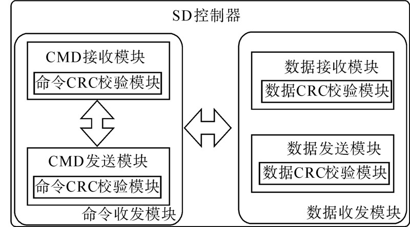 支持SD3.0总线协议[7]的TF卡速度等级为UHS-I,最高读写速度达104 MB/s,TF卡有3种工作模式:非激活模式、卡识别模式和数据传输模式。 图 4为SD控制器的结构,控制器由命令传输模块和数据传输模块构成,命令和数据管理分开控制,便于数据控制和调试。数据模块受命令模块控制,2个模块之间进行通讯协作,数据模块根据命令模块发出的命令进行数据的发送或接收,这样结构紧凑,控制方便,而且可以减少FPGA的资源消耗。