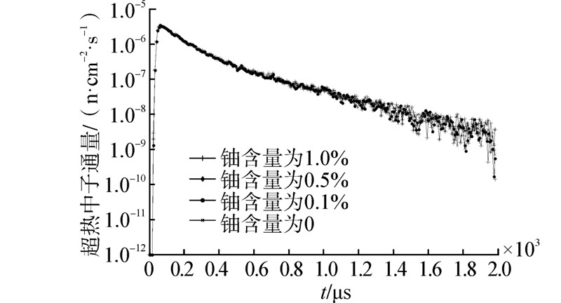 瞬发裂变中子探测技术利用氦三探测器,记录铀黄饼中由于发生瞬发裂变而增加的超热中子计数。中子源脉宽为10 μs,周期为2 ms,改变黄饼中铀的含量分别为0、0.1%、0.5%、1%,探测器分别记录0~2 000 μs超热中子和热中子衰减时间谱。
