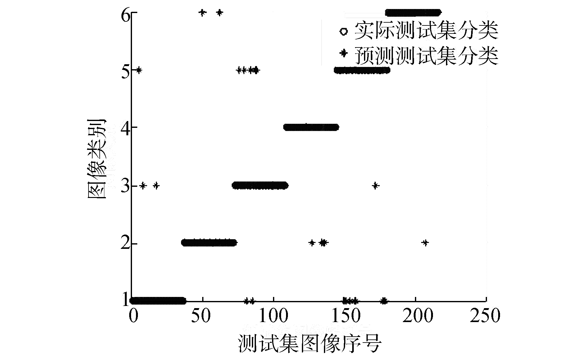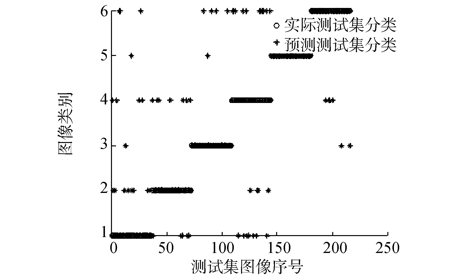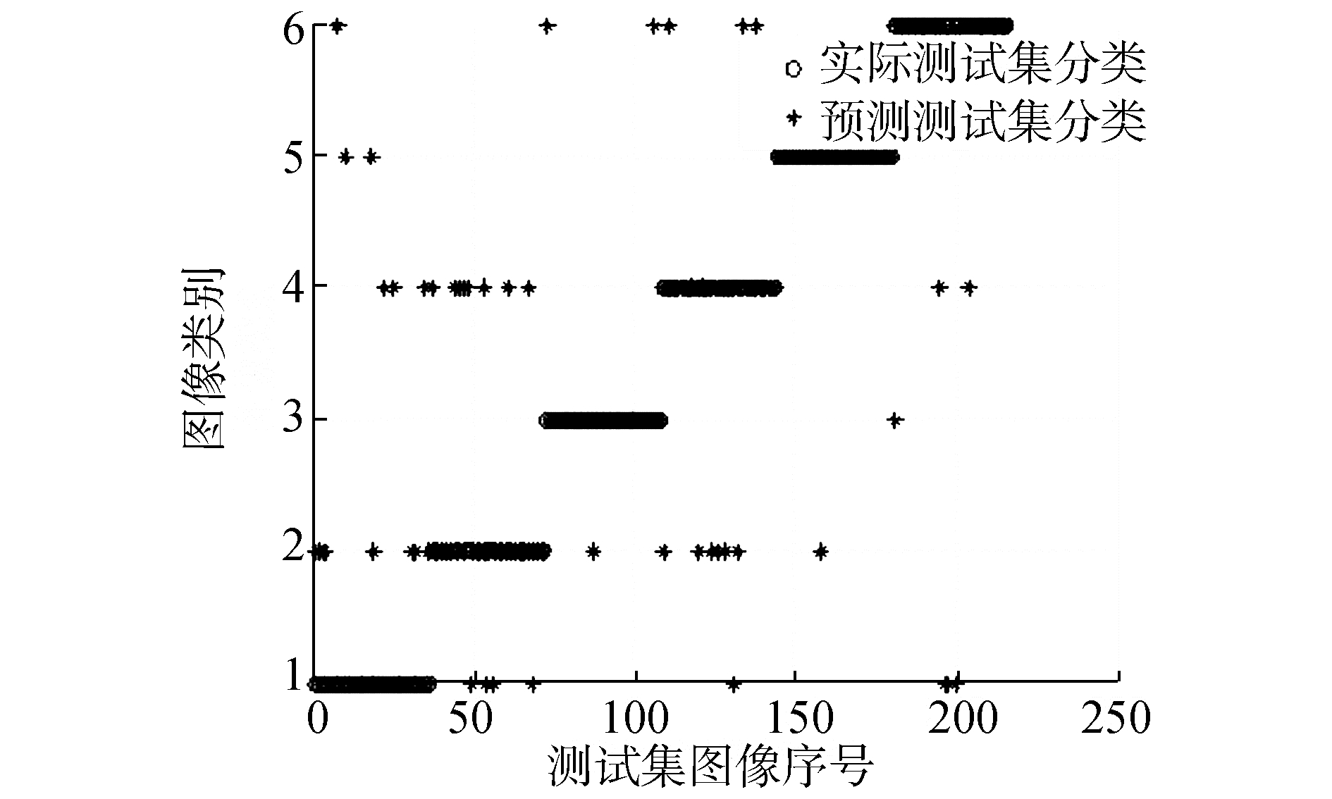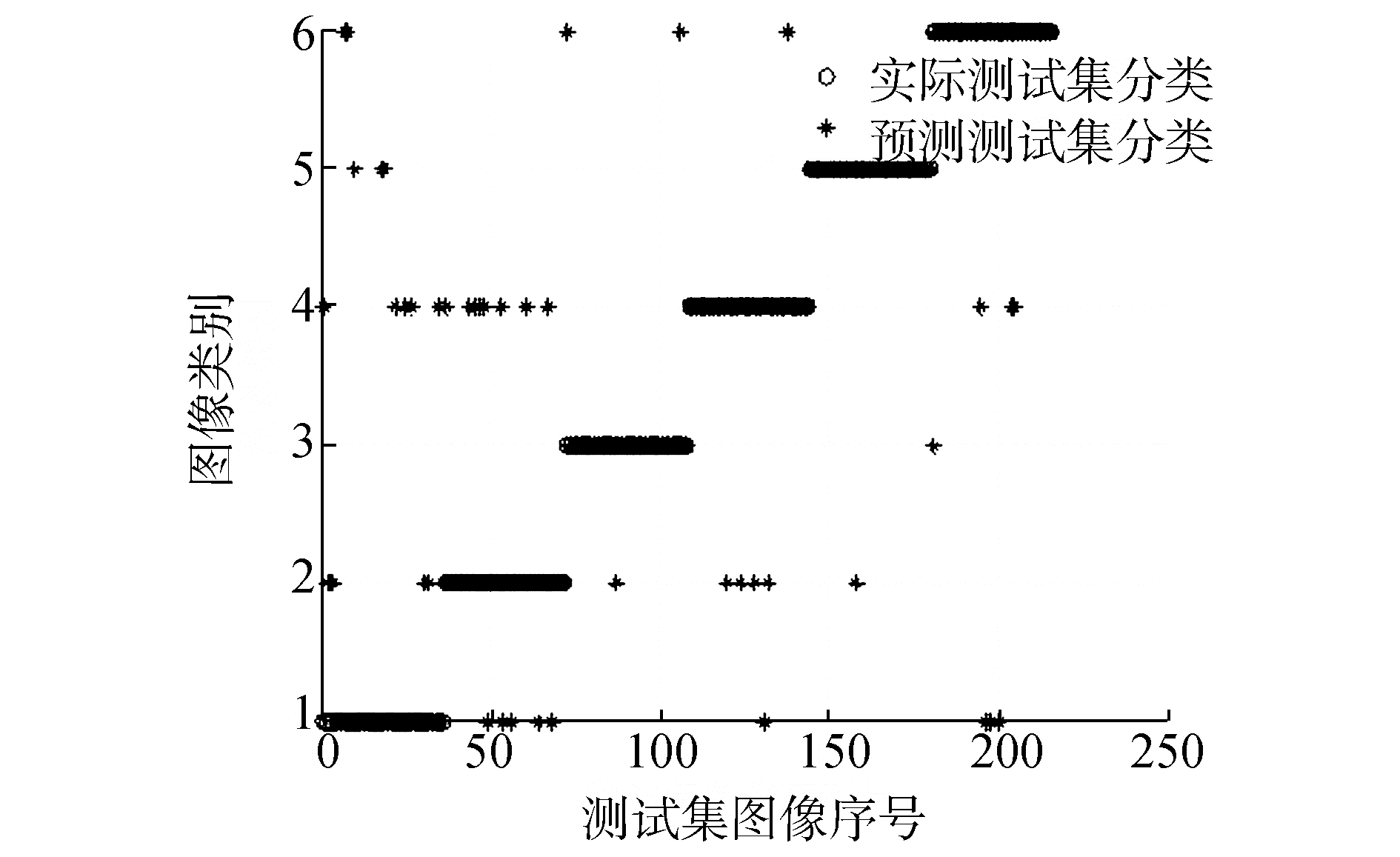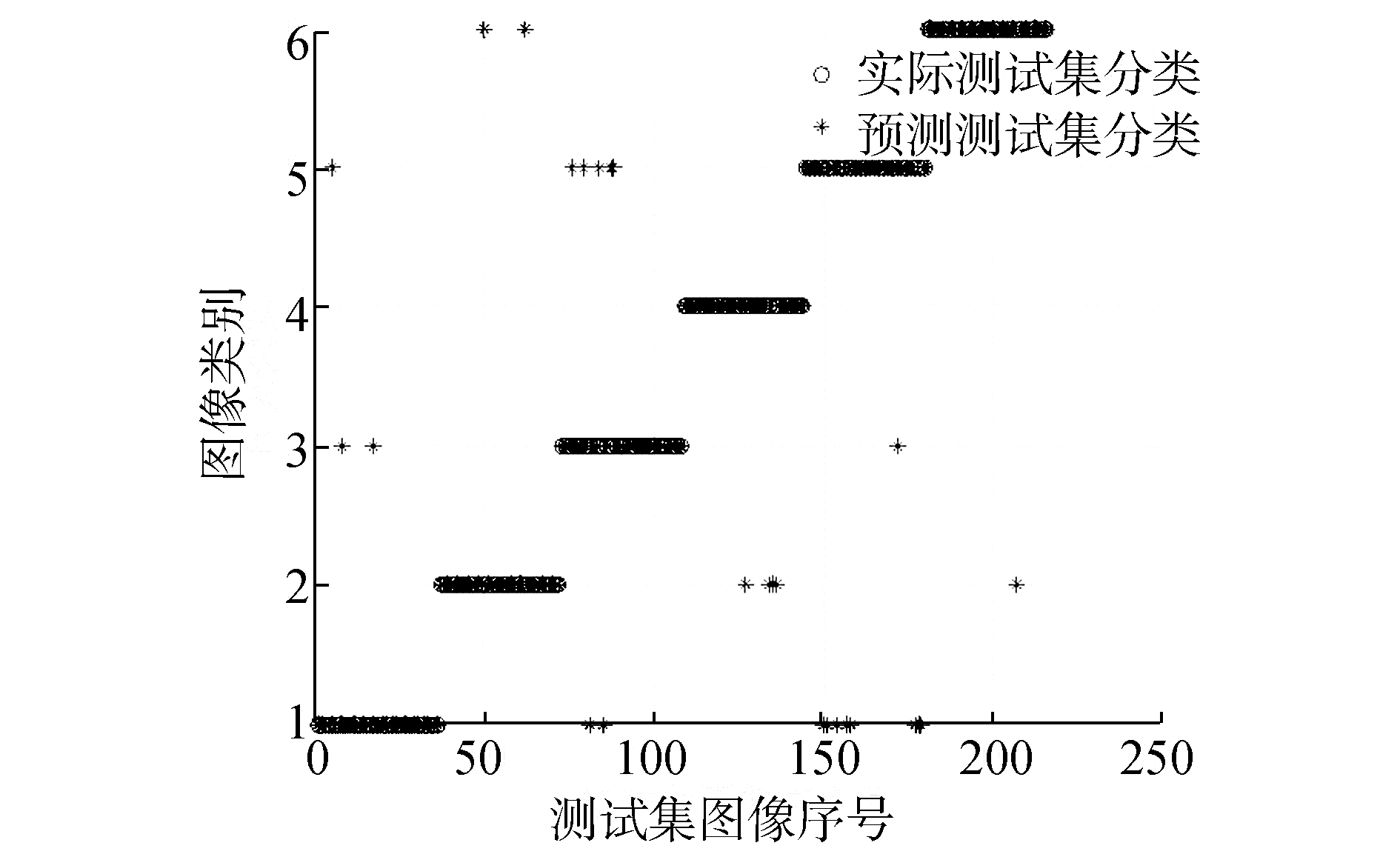 通过4.2.1节实验结果可知热核特征列向量的输入维度选择为18左右其分类准确率最高。因此在热核特征与谱特征的SVM分类准确率对比实验中将输入的热核特征维度固定在18维度,为了避免对不同图像特征截取不同维度列向量对实验造成影响,文中将图像谱特征列向量截取维度也固定在18维度。同时,根据4.2.2的实验得到的结论将热核特征的时间参数选择为t=1。在实验中分别用3种特征点检测算法 (Canny-Harris、Harris-Laplace、改进的特征点检测算法) 建立邻接矩阵特征、拉实验中对图像数据中6类图像进行分类,实验结果如图 10~19所示,其中圆圈表示实际测试集的正确分类,星号代表通过SVM预测后图像的分类结果。图中的横坐标为图像216幅图像的序列号,纵坐标表示图像的类别。利用Canny-Harris特征检测后建立热核等特征进行SVM分类实验结果如图 10~12。