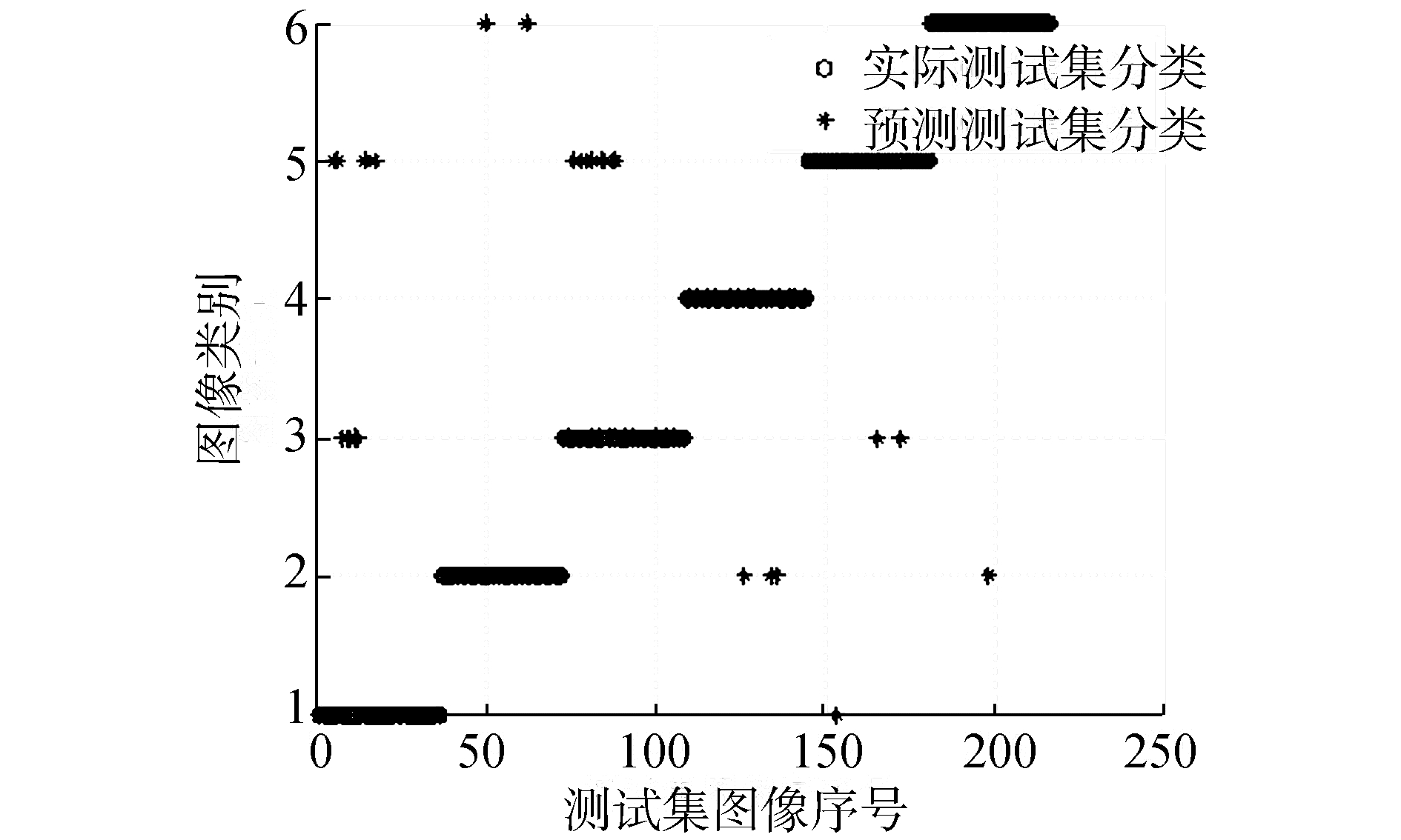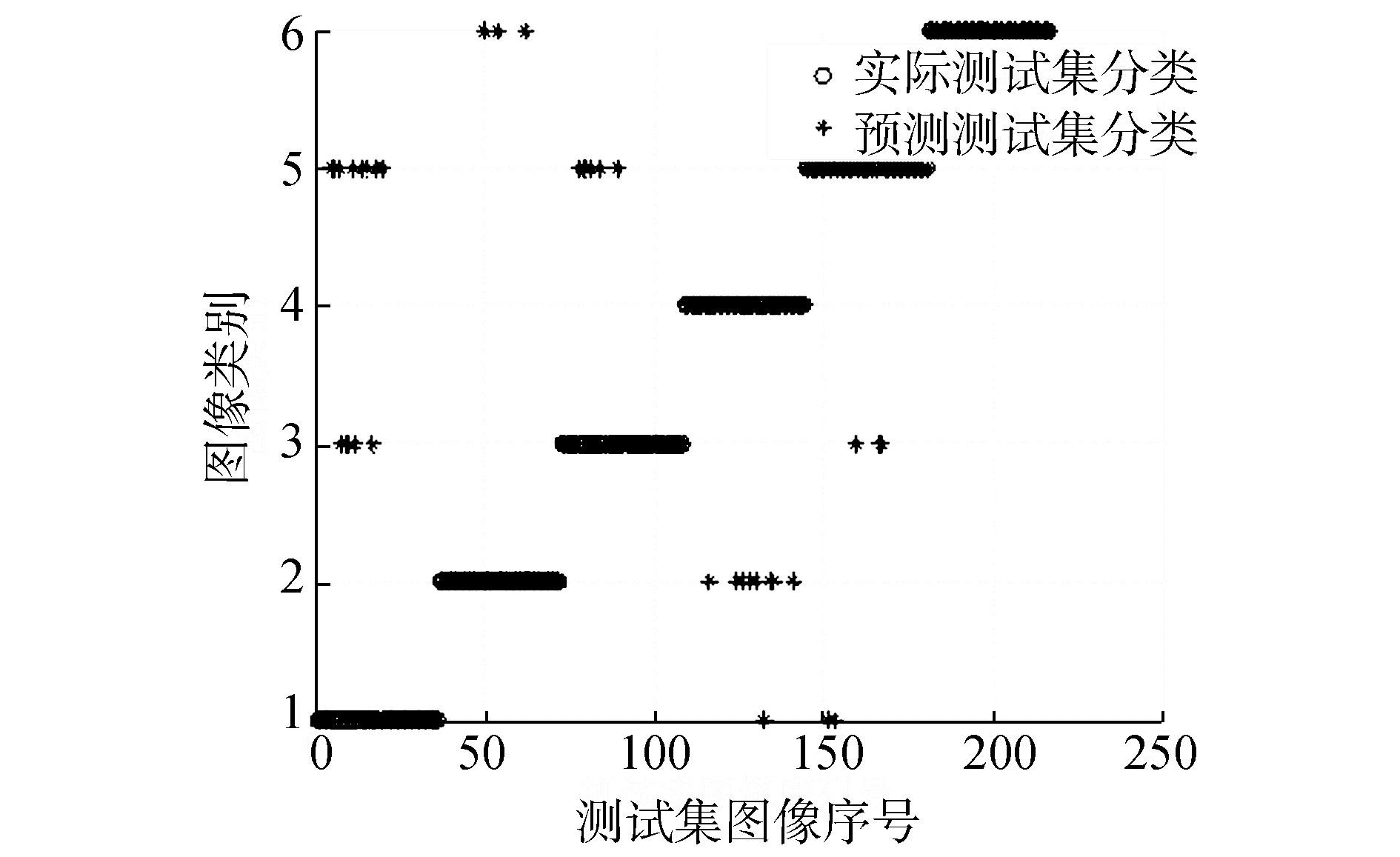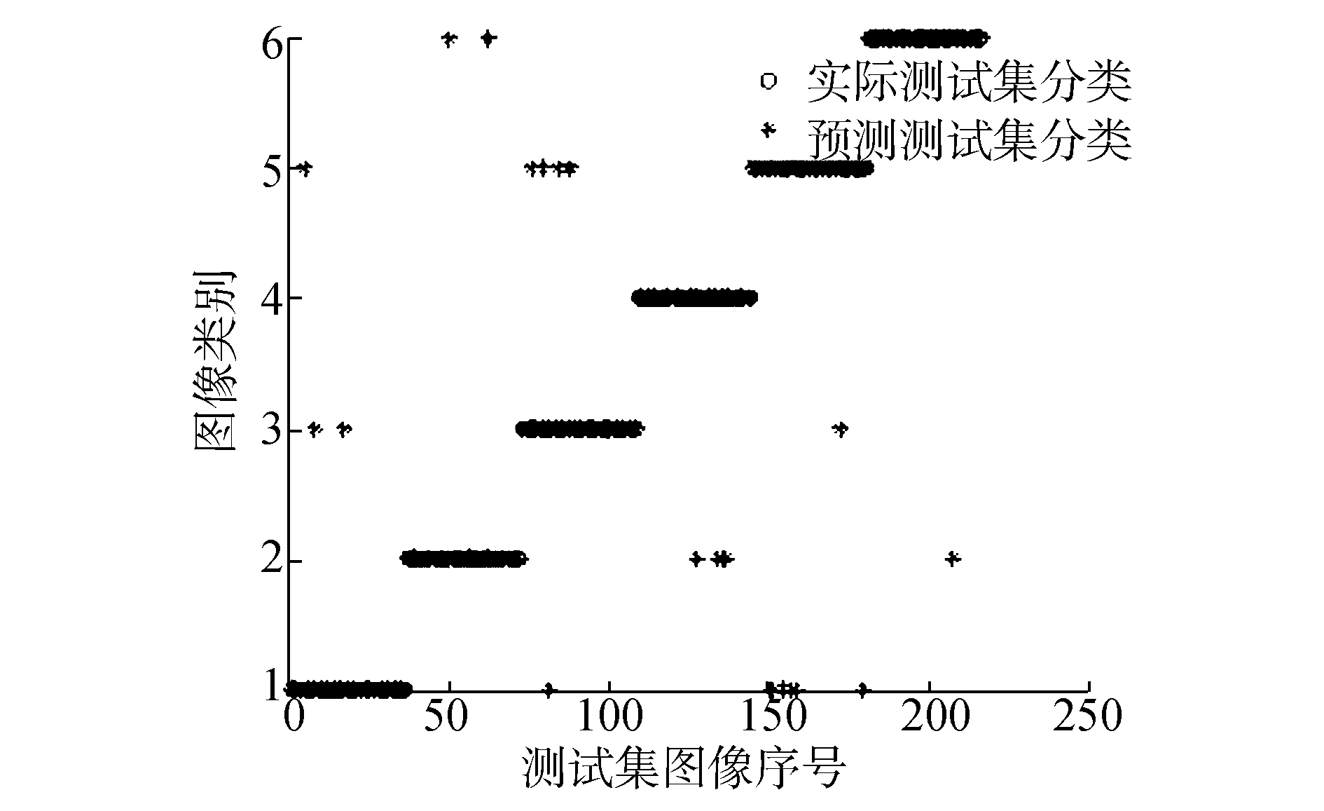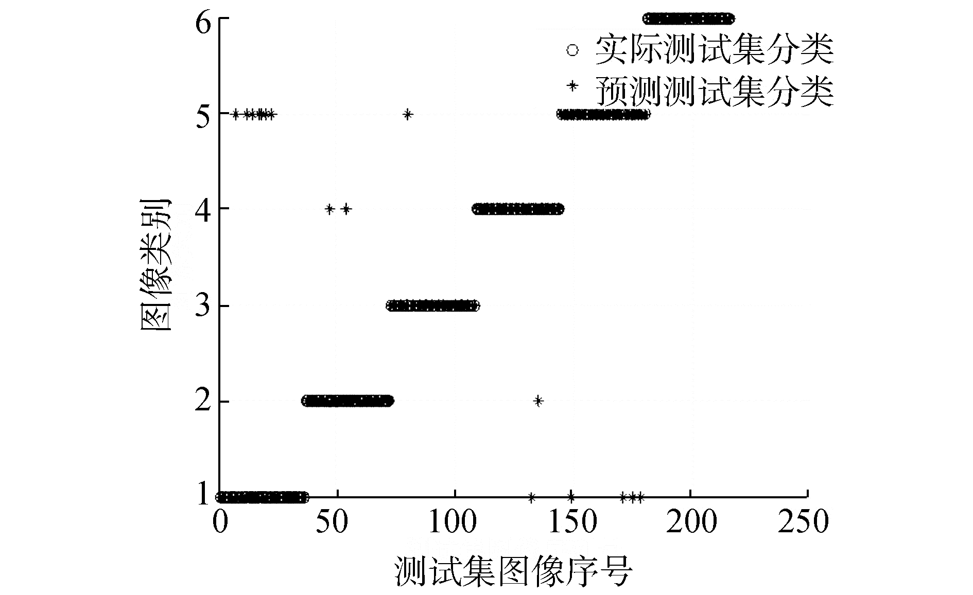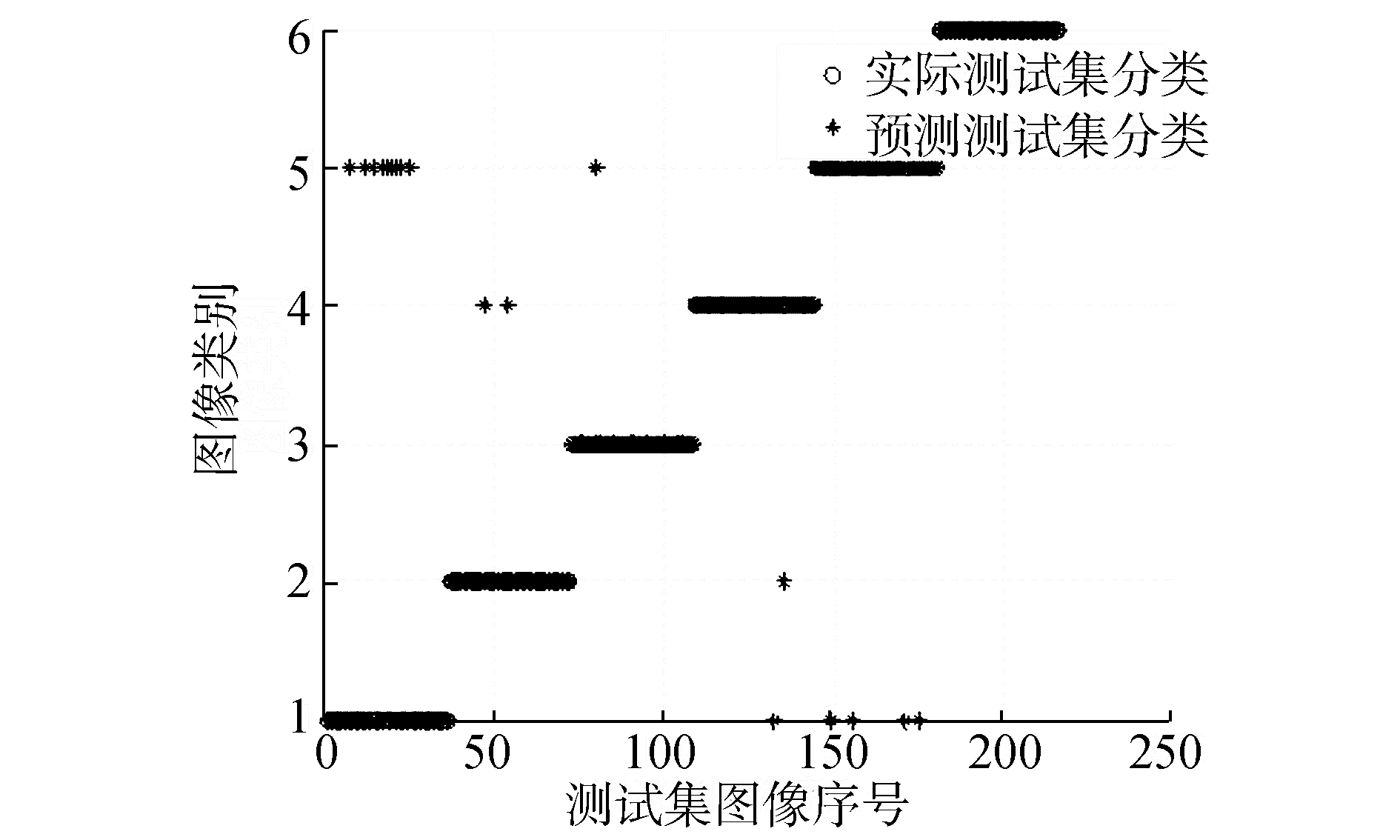 通过4.2.1节实验结果可知热核特征列向量的输入维度选择为18左右其分类准确率最高。因此在热核特征与谱特征的SVM分类准确率对比实验中将输入的热核特征维度固定在18维度,为了避免对不同图像特征截取不同维度列向量对实验造成影响,文中将图像谱特征列向量截取维度也固定在18维度。同时,根据4.2.2的实验得到的结论将热核特征的时间参数选择为t=1。在实验中分别用3种特征点检测算法 (Canny-Harris、Harris-Laplace、改进的特征点检测算法) 建立邻接矩阵特征、拉实验中对图像数据中6类图像进行分类,实验结果如图 10~19所示,其中圆圈表示实际测试集的正确分类,星号代表通过SVM预测后图像的分类结果。图中的横坐标为图像216幅图像的序列号,纵坐标表示图像的类别。利用Canny-Harris特征检测后建立热核等特征进行SVM分类实验结果如图 10~12。