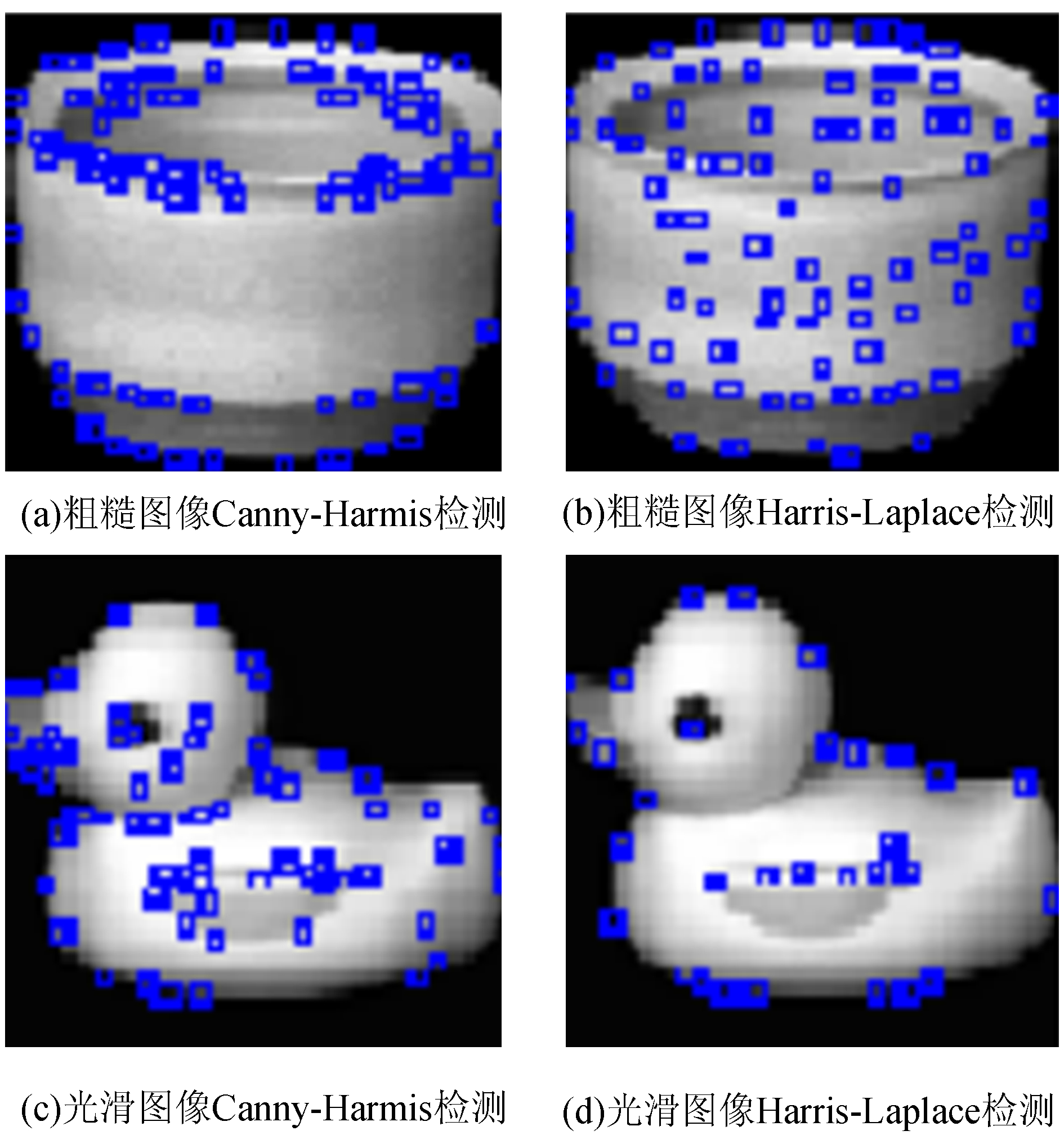 图 2(a)、(b)是分别用Canny-Harris和Harris-Laplace对纹理较粗糙图像进行的特征检测,图 2(c)、(d)是分别用Canny-Harris和Harris-Laplace对纹理较光滑图像进行特征检测。可以看出对于纹理较粗糙的物体表面图 2(a)、(b)利用Canny-Harris角点的检测方法,图像粗糙表面中的许多细节纹理角点检测不到,而只检测到了强边缘和弱边缘。而用Harris-laplace角点检测则可以很好的识别图像中纹理较粗糙的细节信息。对于纹理较光滑的图 2(c)、(d)中小鸭子的翅膀下方和小鸭子的颈部都有弱边缘存在,但通过Harris-laplace算法并没有很好地检测到,而用canny-Harris角点检测算法就可以检测到这些弱边缘中的特征点。