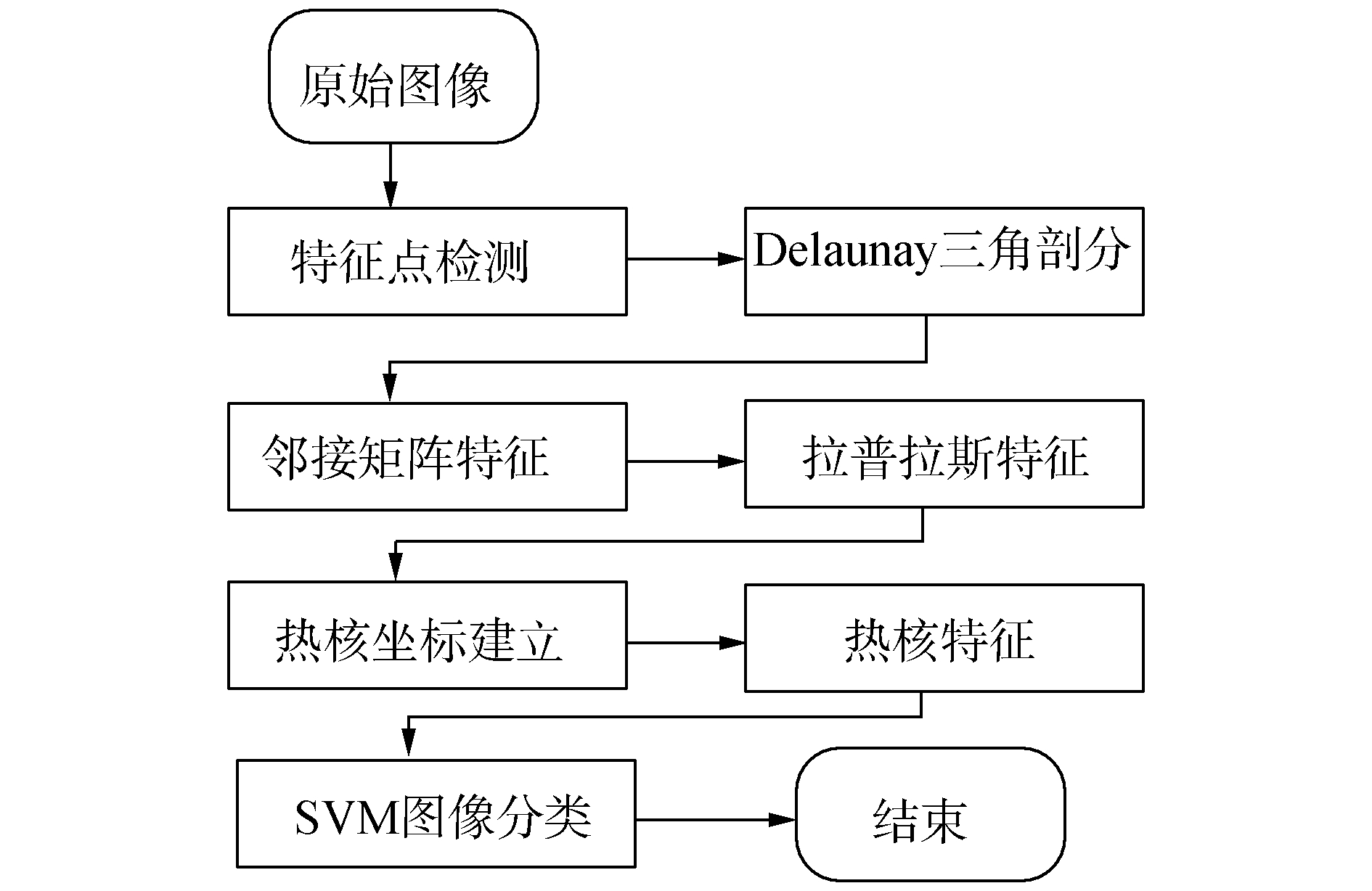 3 利用图像热核特征进行图像分类文中提出的图像分类方法流程如图 5所示。首先对输入图像提取相应特征点并进行Delaunay三角剖分;然后在此基础上得到图像谱特征以及热核特征,利用热核特征作为SVM的输入,从而实现图像分类。
