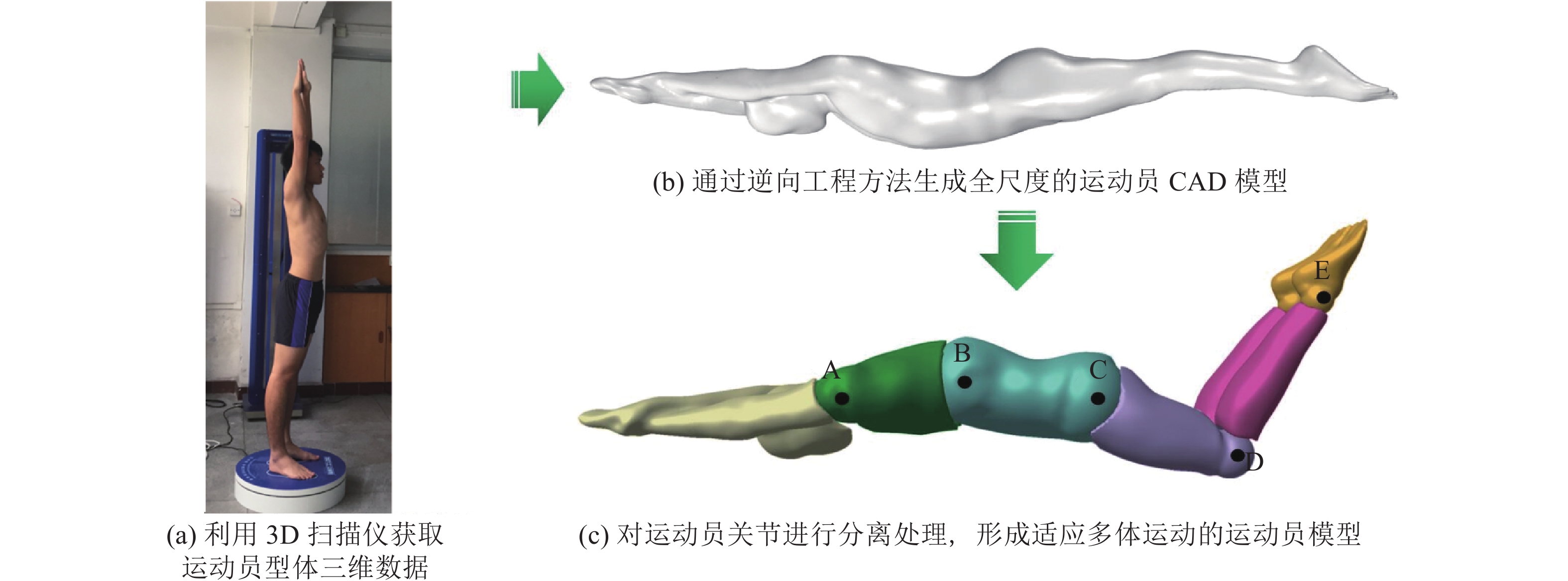本研究选取一名高校优秀游泳运动员(身高178 cm,体重71 kg)为型体采样对象。图1为人体模型的制作过程。