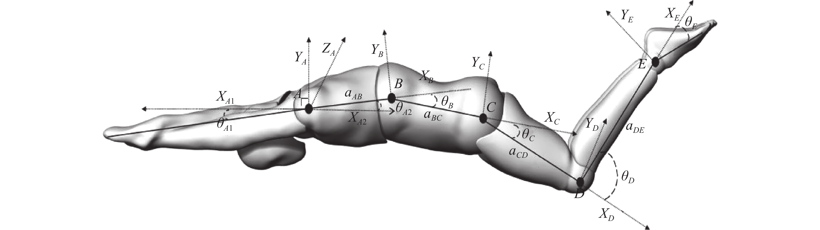 $ {a_{AB}} $ 、$ {a_{BC}} $ 、$ {a_{CD}} $ 和$ {a_{DE}} $ 分别代表A到B、B到C、C到D和D到E的距离,$ {\theta _{A1}} $ 与$ {\theta _{A2}} $ 为上肢和水平位置之间的角度,$ {\theta _B} $ 、$ {\theta _C} $ 、$ {\theta _A} $ 、$ {\theta _E} $ 为相邻关节之间的角度。A点设置为参考原点,B、C、D和E点的运动方程推导公式为