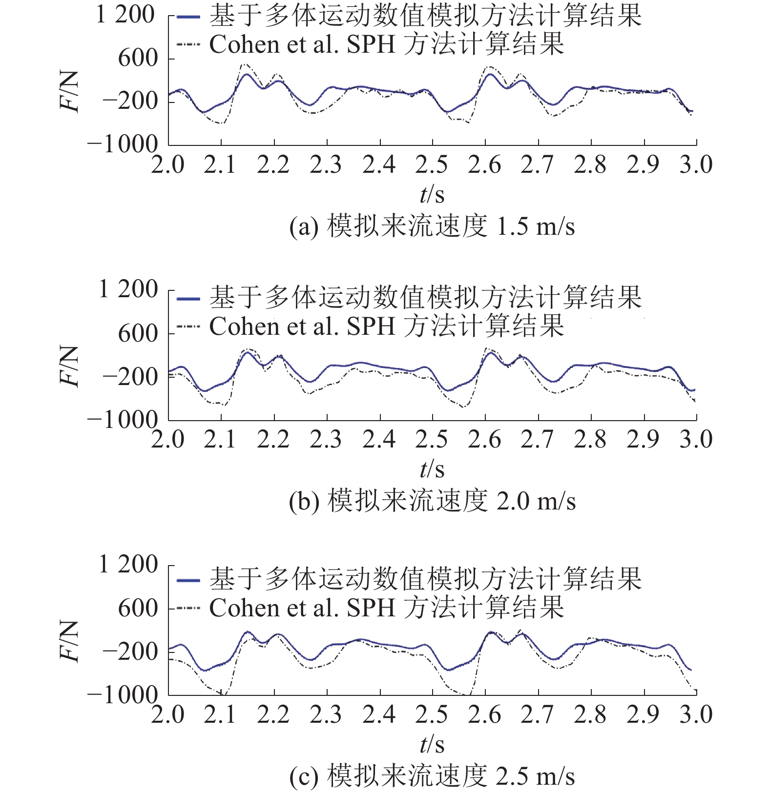 本研究参考前期的全尺度游泳运动员数值模拟的动网格网格无关性验证的结论对计算域进行划分[18]。文中选取Cohen等[14]的海豚泳研究数据作为参照,对本数值模拟方法的可行性进行验证,模拟来流速度分别设置为1.5、2.0和2.5 m/s。图3为运动员的运动方向净流向力的变化情况。从整体来看,在不同的工况中,2种方法的净流向力曲线变化趋势较为吻合。