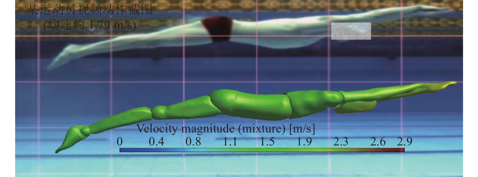 图 3 本方法与SPH方法[14]计算结果对比情况另外,图4为1名国际水平运动员海豚泳视频进行动作分析,提取该名运动员的技术动作和稳定阶段的游动速度(约为1.79 m/s),并以此作为本方法验算的运动轨迹及速度边界条件。数值结果显示,以1.79 m/s游动时,获得的平均推进力为–1.71 N,接近满足匀速运动时,阻力和推进力为一对平衡力的要求,误差可能来自于处理后的多体模型与实际运动员模型的差异。