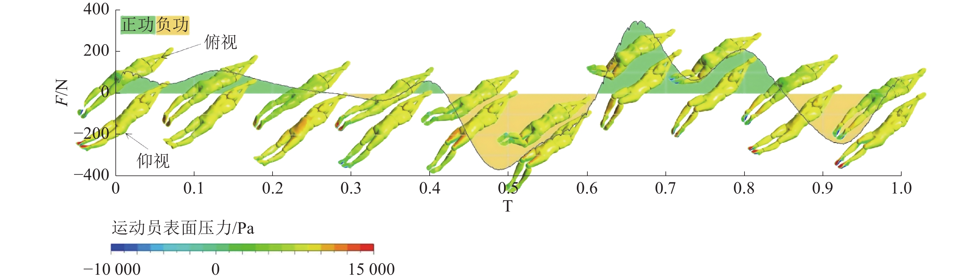 在实际的游泳过程中,当运动员配速趋于匀速时,在完成单个完整运动周期内,推进力与阻力所做的功基本相等[19]。本研究中,当模拟游进速度1.4 m/s,满足以上条件。图5为运动员的游进速度为1.4 m/s的瞬时姿态与净流向力变化对应图。图5中的T为1个运动周期,为无量纲量。在运动周期初期,运动员下肢向上打腿,膝关节减速屈曲,角速度和动作速度逐渐减小,在接近0.48 T处抵达膝关节屈曲极限,此时净阻力达到最大值;随后,运动员开始向下伸展打腿,净阻力减小,推进力极速增大,在0.66 T处,推进力达到峰值,且推进力作用时段延续至0.85 T处;接下来,运动员继续向下伸展打腿,推进力减小,净阻力逐渐增大,并在0.93 T周期处达到第2大阻力峰值;最后,膝关节抵达最大伸展角度,返回到初始位置,完成1个周期打腿。由此可见,膝关节屈曲是游泳运动员阻力增加的主要原因,而向下打腿与向上打腿对产生推进力均有积极作用,其中向下打腿运动是最为重要推进力产生来源[20]。在早期的研究[21]中,学者们发现优秀的海豚泳运动员其膝关节的伸展程度通常大于普通水平的运动员。近期,Yamakawa等[22]的游泳数值模拟研究也表明运动员的游进速度与最大膝关节角度有较大相关性。因此,针对特定运动员开展膝关节伸展运动研究对于改进游泳性能有积极作用。