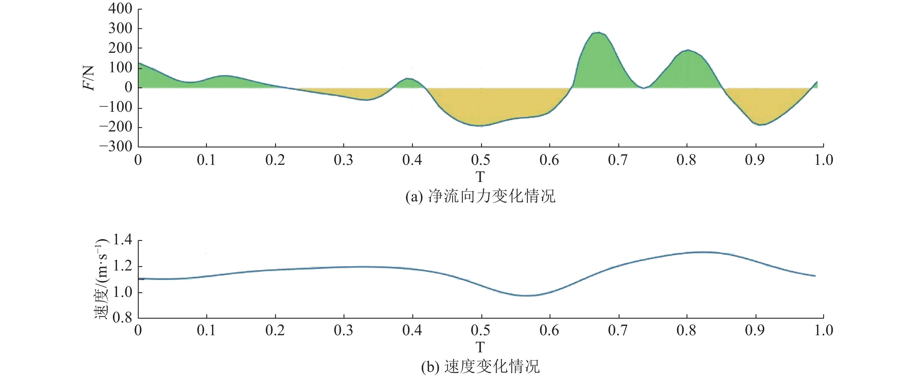 本环节参考文献[14]海豚泳动态游动数据,通过在来流入口设置速度函数模拟运动员变速游动。如图6所示,变速游动状态下,运动员的推进力与阻力的变化趋势和前面的匀速运动情况保持一致,但是变速运动时净流向力的波动幅度比前者更小,减速与加速对于力的峰值有明显的抑制效果,与参考文献[14]相符。尽管如此,在实际的海豚泳稳定游进过程中,运动员的速度波动是极为轻微的,Colman等[23]的海豚泳实验发现运动员采用海豚泳游进时其质心的速度非常恒定,我们在近期的海豚泳视频动作分析中也验证了这一观点。