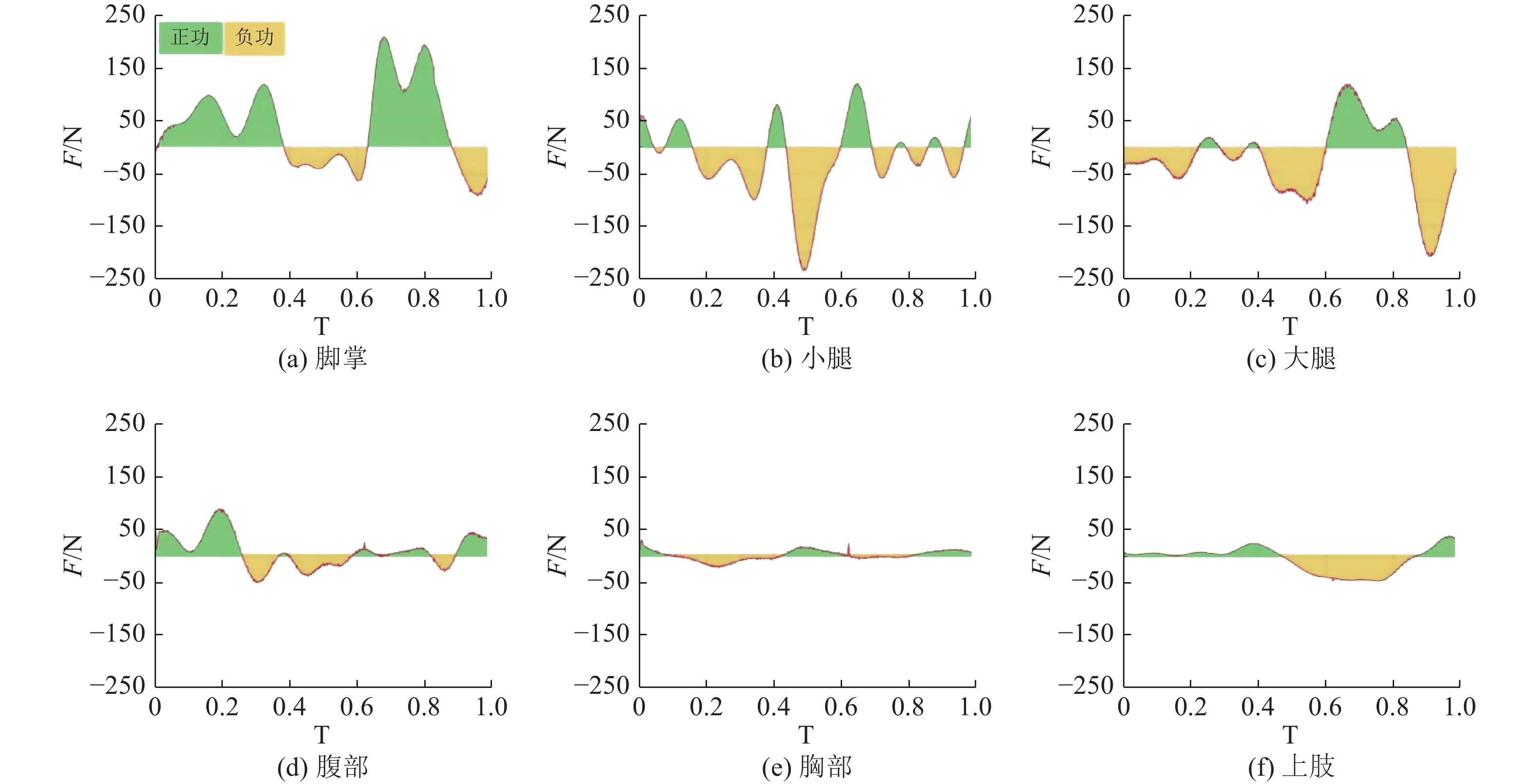 为进一步了解海豚泳的水动力特征,本研究对游动过程中运动员身体各部分产生的推进力和净阻力进行分析。图7为在1个完整的运动周期内,下肢体(脚掌、小腿、大腿)对海豚泳的游动性能起主导作用。其中,在向上打腿与向下打腿中,脚掌均为主要的推进力来源部位;另外,小腿和大腿的运动,是净阻力的主要来源,这可能是小腿、大腿在矢状面上做上下摆动动作,造成了运动员游进方向投影面积的增加,从而产生了较大的形状阻力。在0.48 T周期处小腿出现最大净阻力峰值,此时大腿及上半身几乎处于水平姿态,而小腿与水平方向成较大攻角,小腿背面直接承受来流作用,引起了较大的压差阻力;大腿出现最大峰值时刻在0.9 T处,其原因与前者相似。虽然,小腿与大腿贡献了大部分的阻力,但下肢发达的肌肉群(大腿、小腿)是支撑脚掌充分地与水相互作用产生强劲推进力的关键。另外,腰部对整体动态阻力的影响弱于脚掌、小腿与大腿,但值得留意的是,腰部上下摆动所做的正功要大于负功;除此之外,腰部作为连接上肢与下肢的重要桥梁,对维系流线型姿势具有重要积极的意义,腰背肌力量与海豚泳游泳性能高度相关[24],因此,增强腰背肌力量也应是质量训练中的重要一环。此外,虽然从计算结果看胸部及上肢运动产生的动态阻力较小,但其运动依然对海豚泳的表现起重要作用。其中,上胸椎可以抑制下肢的波动及保持手臂的小攻角从而减少阻力[25]。上肢做负功的区域出现在0.46~0.87 T处,该区间,上肢姿态刚好为向前下方倾斜,与游进方向形成一定的夹角,导致了净阻力的额外增加。由此可见,改善上肢运动对于提升海豚泳性能也具有积极意义。