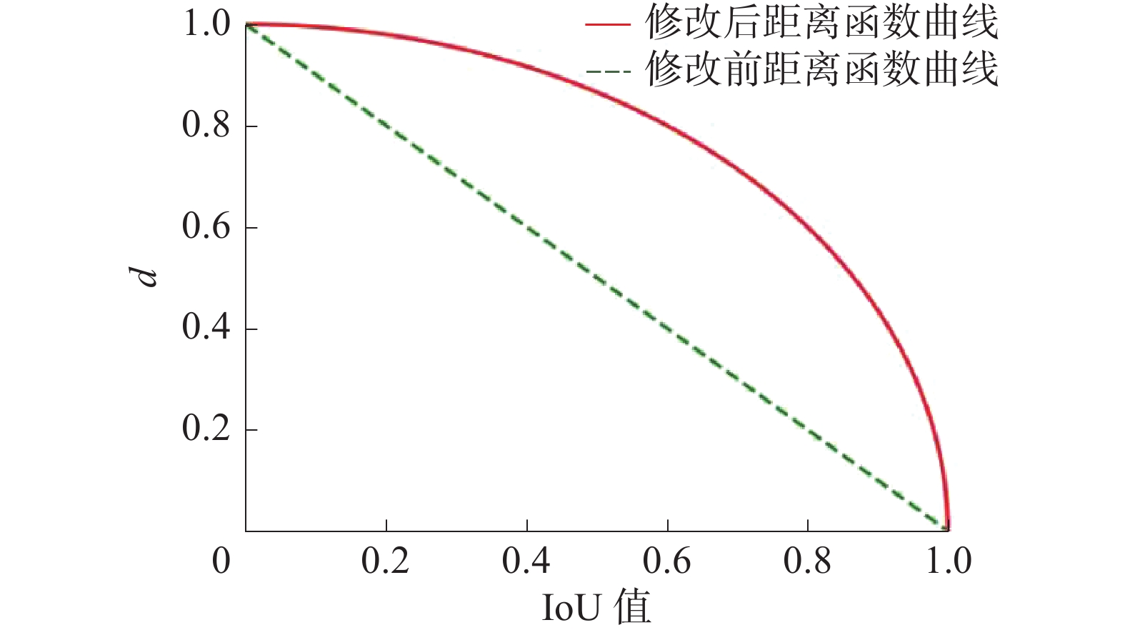 $$ d(b,c) = \sqrt {1 - {\text{Io}}{{\text{U}}^2}(b,c)} $$ K-means聚类改变前后距离度量随IoU值改变的对比图如图1所示。由图1可知,实线为修改后的曲线,修改之后的距离度量函数值在IoU值域内总大于改变之前,这表明优化之后的距离度量的确可以放大IoU对距离的影响,提高聚类准确率。