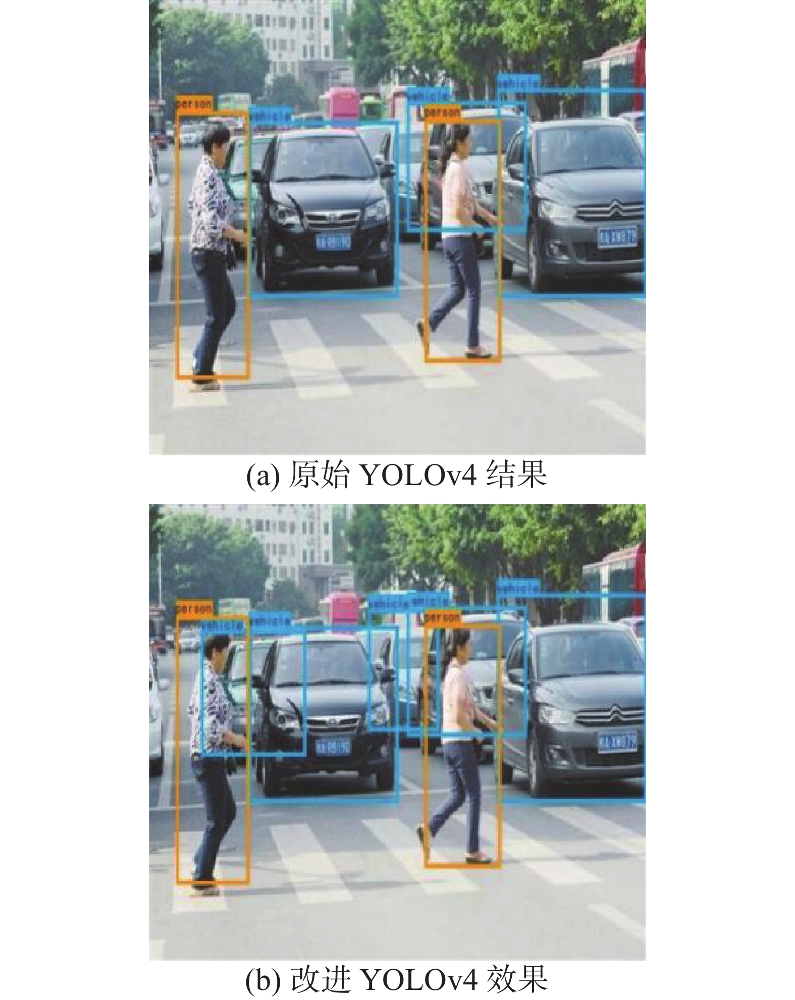 复杂交通场景之下目标之间相互遮挡,原始算法存在漏检问题。如图2近处较为密集致使目标之间存在一定的遮挡,原始YOLOv4算法结果如图2(a)所示,近处5辆汽车仅仅检测出了3辆,对于后面遮挡较为严重的2辆汽车出现了目标漏检问题,严重影响检测结果。改进后的YOLOv4算法检测结果如图2(b)所示,算法可以返回更为准确的目标边界框,能够很好地检测出被遮挡的汽车目标,检测更为准确。