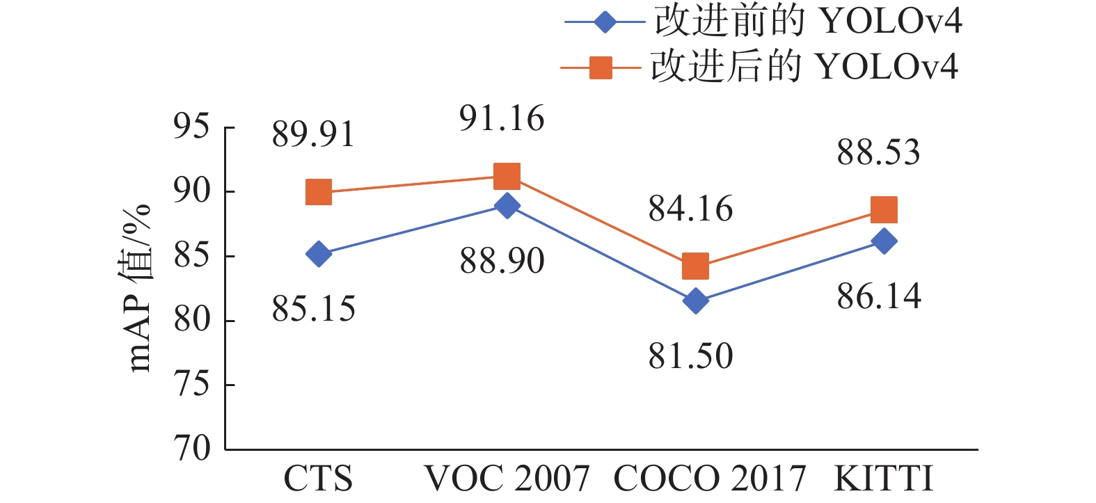 图4给出了YOLOv4算法改进前后不同数据集上对于常见道路目标检测的平均精度变化情况。在本文提出的CTS数据集上,mAP值从改进前的85.15%提升到89.91%;在较为简单的VOC2007数据集上,检测精确率能够达到更高的水平,YOLOv4算法在改进前mAP值为88.90%,改进后达到了91.16%;在较为复杂的COCO2017数据集上,检测精确率与CTS数据集相比下降不多,YOLOv4改进前的mAP值为81.50%,改进后提升到84.16%;在自动驾驶交通场景数据集KITTI上,检测能力也较为突出,YOLOv4改进前后mAP值从86.17%提升到88.53%。这些实验结果表明,改进后的YOLOv4算法对小目标和遮挡目标检测效果不佳、漏检率较高的问题具有一定的解决能力,使得算法在复杂交通场景中依然具有很高的综合检测能力,且适合不同交通场景,能够满足自动驾驶汽车的实际要求。