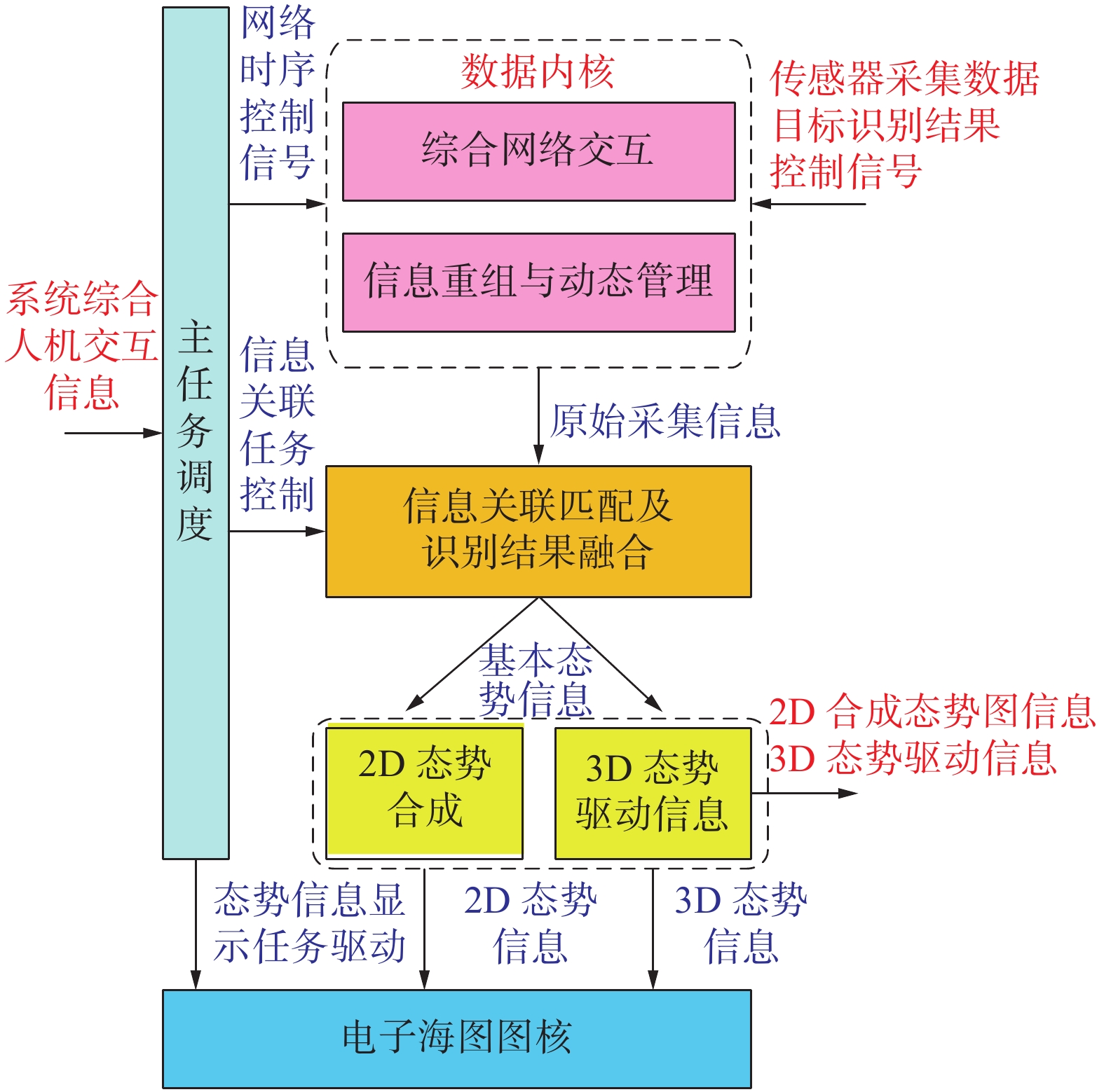 主任务调度模块根据系统综合人机交互信息,确定系统当前主要工作任务,确定系统网络时序控制信号、信息关联任务控制信号以及船舶航行态势信息显示任务驱动信号。综合网络交互、信息重组与动态管理模块实现感知系统主要采集信息的网络抓取、信息变换及重组、动态访问管理等功能,数据内容接收网络时序控制信号,确定数据接收策略,从设备传感器、图像采集处理子系统等获取系统相关数据。