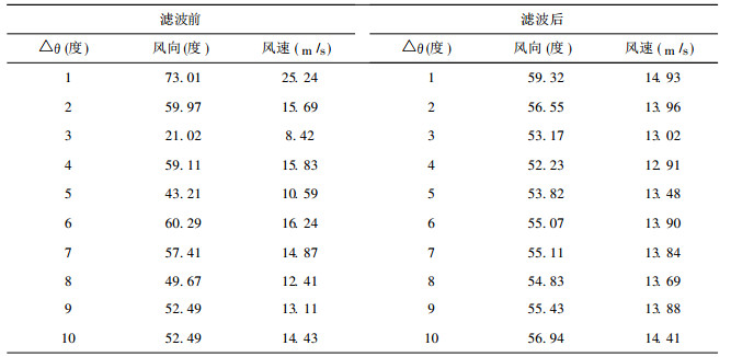 为了选取一个合适的△θ值作为滤波窗口, 我们做了多组对比实验, 表 1为其中一组实验数据, 第100圈 (径向距离20 km) 的以方位角120°为中心、△θ从1°~10°, 所反演出的风向风速结果对比.从表中可以看出, 滤波前计算出的风向风速随△θ的变化很大.如△θ为1°和3°时计算出的风向相差52°, 风速相差3倍.它显示出在△θ很小的情况下, VAP方法的计算结果不稳定.但是当△θ大于7°时, 计算结果比较稳定, 风向的变化只有10°左右、风速的变化只有2 m/s左右, 但这样的分辨率已不能满足中-β尺度分析的要求.表 1还表明, 经过滤波后, 在△θ为2°~5°时计算出的风速和风向的差别相当小, 只有不到1 m/s和几度的差别, 是中尺度风场分析可以接受的.