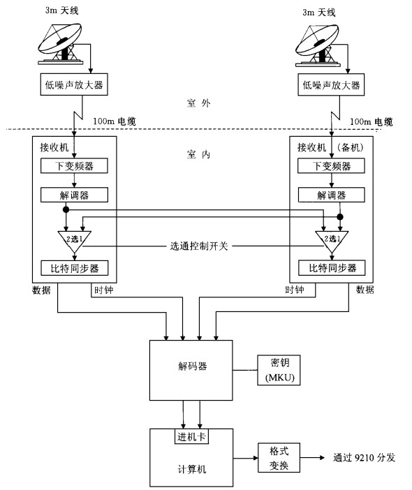 接收系统前放噪声小于0.65 dB, 以满足误码率小于10-6的要求.下变频器、解调器、比特同步器装在一个机箱内.解码器和密钥分别购自欧洲一公司和EUMETSAT.帧同步器、缓冲器接口采用一体化卡结构插入计算机内.