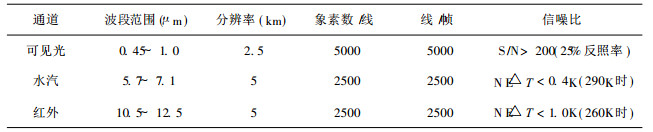 1 MVIRI成像仪和HRI传输特性Meteosat-5卫星主要有效载荷为Meteosat可见光和红外成像仪MVIRI. MVIRI是一个3通道的成像仪, 是世界上第一个在静止气象卫星上获得水汽通道图像的扫描辐射器, 每幅图像成像时间为25 min.其性能如表 1所示.