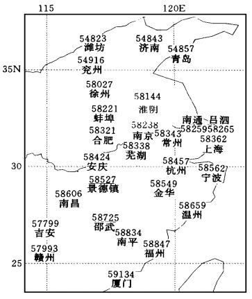 | 图 2. 检验所用的华东地区 27个测站分布 | |