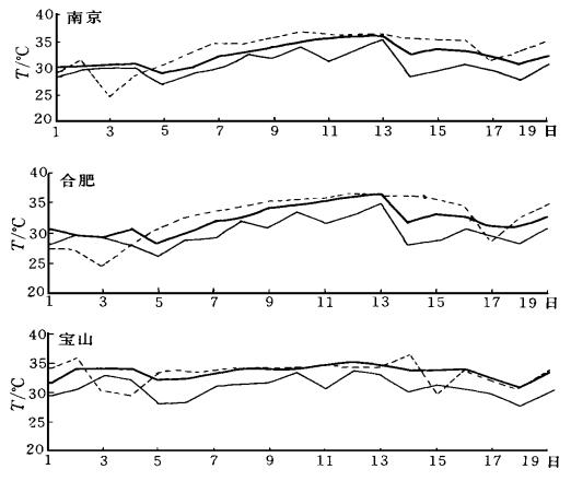 | 图 3. 1998年7月1~19日3个测站06:00温度实况和预报 (图中虚线表示实况, 细实线是SLAM4的预报, 粗实线是SLAM5的预报) | |