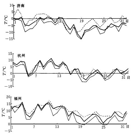 | 图 4. 1998年1月3个测站18:00温度实况和预报 (说明同图 3) | |