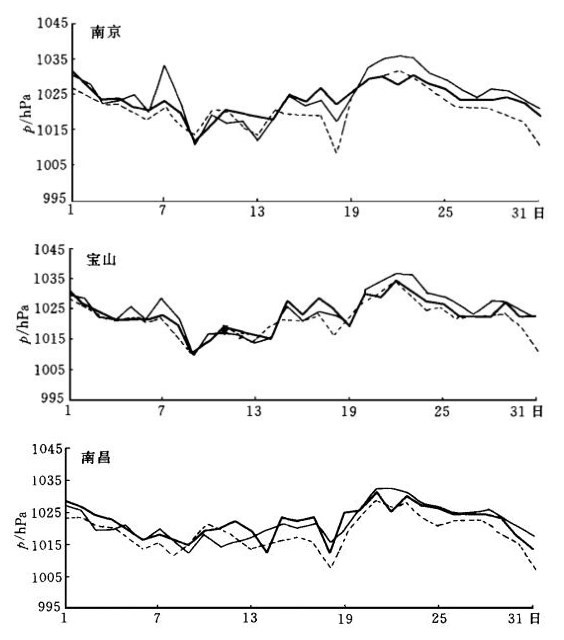 | 图 5. 1998年3月3个测站12:00海平面气压实况和预报 (说明同图 3) | |