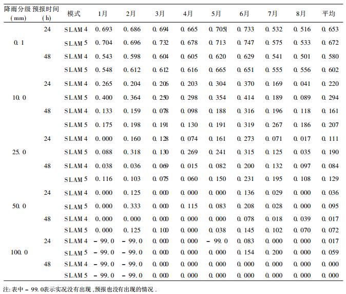 表 2是1998年1~8月逐月降水的整体TS评分 (WTS).SLAM5的预报水平比SLAM4有一定程度的提高, 特别是中雨、大雨、暴雨和大暴雨的TS评分, SLAM5明显高于SLAM4.