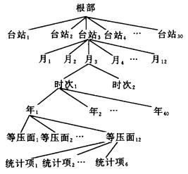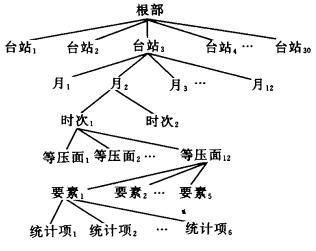 历年值基本数据集的逻辑结构是根据数据项之间的关连和累年值统计的需要, 设计为树形层次结构 (见图 1), 从根部往下分为6层, 依次是台站、月、时次、年、等压面、要素历年值统计项, 其中“年”放在第4层, 与正常次序有所不同, 因为累年值统计是在历年值基础上完成的, 这样设计使后面将要进行的累年统计容易一些.